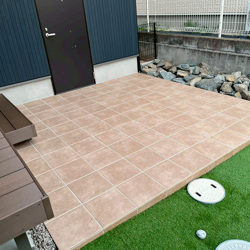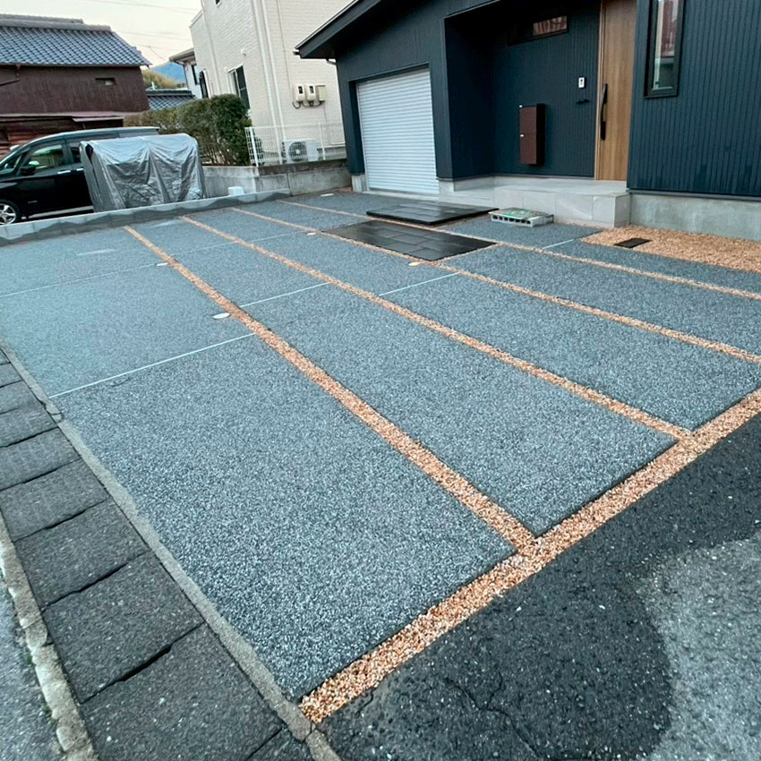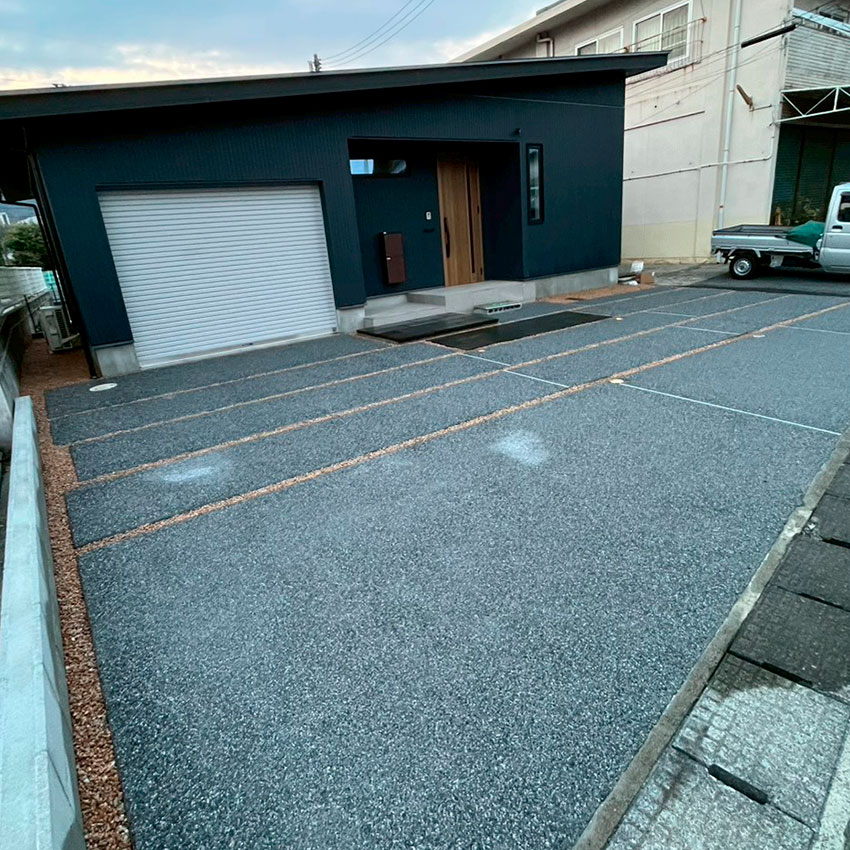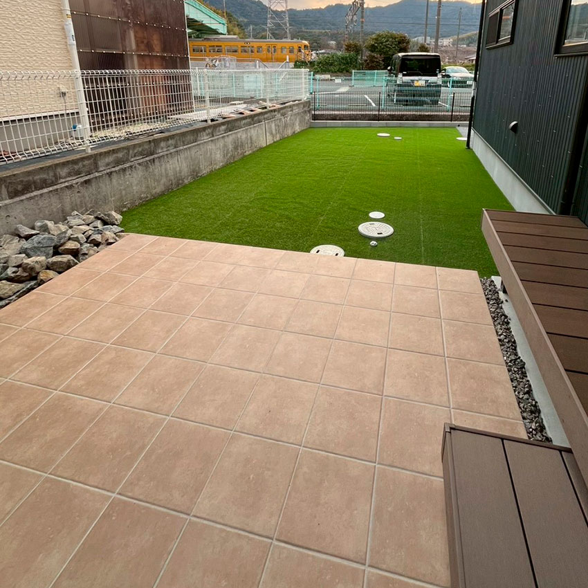 愛犬と安心して過ごせるお庭をテーマに、人工芝のドッグランスペースを設けた外構プランです。リビングからスムーズに庭へ出られるよう、ウッドデッキからステップを経てタイルデッキへとつながる動線を計画し、愛犬もご家族も使いやすい空間に仕上げました。駐車場はタイヤ痕が目立ちにくいよう、全面を洗い出しコンクリート仕上げとし、美しさと機能性を両立しています。日常の使いやすさとメンテナンス性にも配慮した外構です。